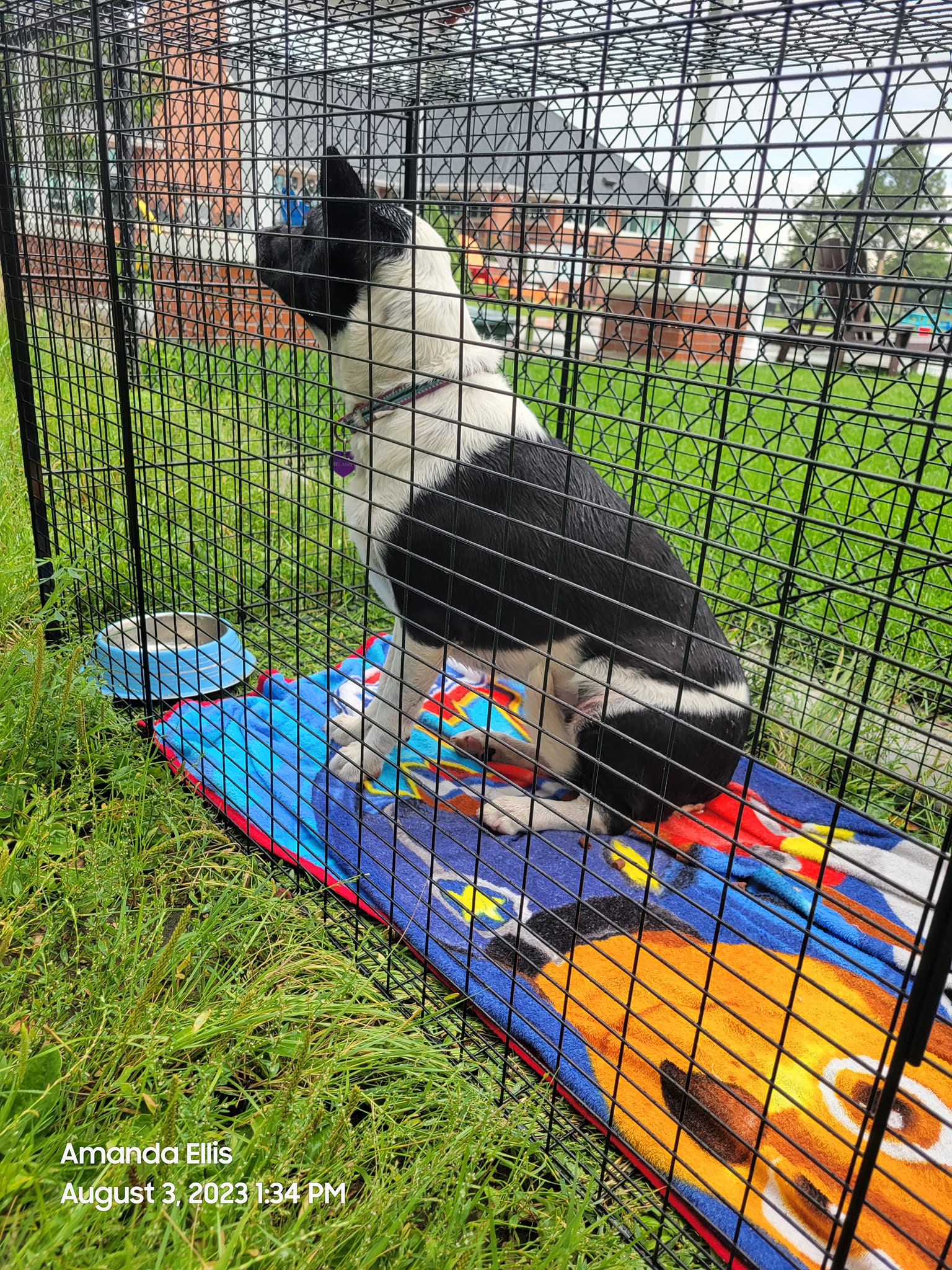 On July 26th, 2023 we were alerted to a post about a dog actively being chased by a golf cart, with video footage included. That evening PD was called and the dog ended up chased over a fence that led to the base. A few days went by and we heard nothing so we waited to see if the dog had been caught or was still at large. We got confirmation the dog was on base, at large. On August 1st a post went up of the same dog running loose in Lion’s Park. We went over and tried calming signals and food lures for roughly 5 hours. We decided to go grab the trap and give it a shot. We spent about 2 hours with the trap set. When we arrived with the trap a symphony was getting ready to play in the pavilion. She was there but quickly got up to move – we never saw her again that night. We put out a post on all lost pet pages for Cheyenne, to alert the public not to chase & that we were working on her case. The next morning we got confirmation she had ran back on base. Folks assisted getting word on the base post about our efforts to contain her. Folks began calling/texting me to let us know what was going on. The staff at the Adventure Park were feeding her and trying to lure her in their doors – to no avail. We decided that this would be the perfect place to trap & they agreed to allow us. On August 3rd we showed up at 8am to set the trap. She came by as we were setting up but a noise spooked her and she ran off. Or so we thought. We had no luck spotting her for hours. I decided to stay in the parking lot and just sit & wait it out. The staff member said when it rains she always comes up to the patio. Sure enough it started raining & I watched her slither out from under a walking bridge, she had been right there the entire time! Unannounced to me, the staff had opened a door again and tried to lure her in again. They called me and said she grabbed the treats and ran. They said she ran right past the trap. I told them to remain calm and give her a few. I knew she would smell the food and be right back. At this point it was roughly 1pm and I needed to go in and use their restroom. As I walk in they tell me she is in the trap but it’s not triggering. I walk to the window and she is fully in & the door is shut. We got her! She was safe finally! She had a collar with a tag, her name is Belamie, we tried the number in the field & sure enough it was disconnected. Now here comes the back story….