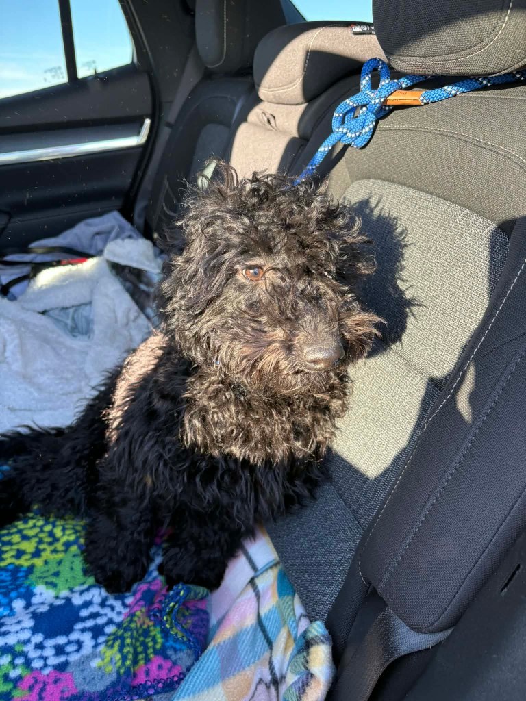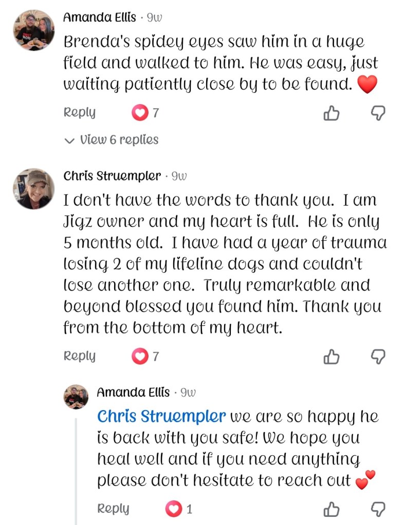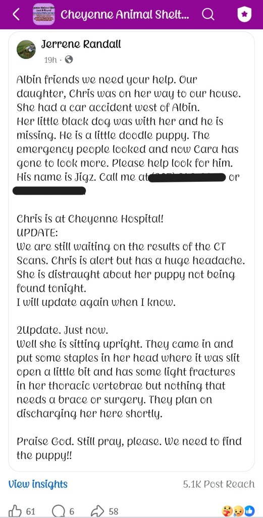 January 3rd, 2026 Jigz and his owner were headed to their family’s home when they were involved in a pretty serious car accident about a mile west of Albin. Chris was taken to the hospital and Jigz had gone missing. Her family pleaded on Facebook for help locating Jigz. Brenda is really familiar with Albin so the next morning she went looking for Jigz. Her spidey eyes saw him in a huge field hunkered down close to the accident. She used calming signals and lured him to her slowly. Jigz was reunited with family and so glad to reunite with his mom once she was released from the hospital.